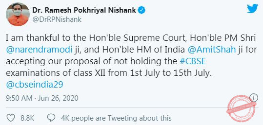 The Central Board of Secondary Education (CBSE) has decided to cancel the Grade 10, 12 Board exams 2020, which was scheduled from July 1 -15, 2020. The board would now assess the students based on scores of the previous three examinations and declare the Grade 10, 12 results by July 15.